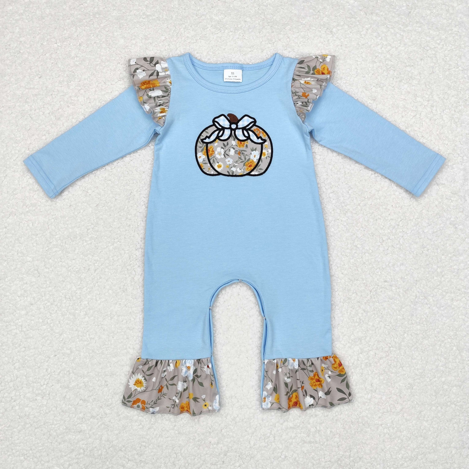 rts no moq LR1529 Embroidered butterfly pumpkin flower lace blue long-sleeved jumpsuit