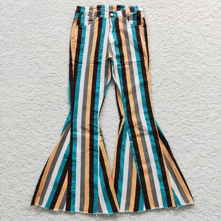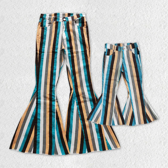 RTS NO MOQ Mommy and Me Adult Baby Girls Green Grey Stripes Denim Bell Flare Pants Jeans