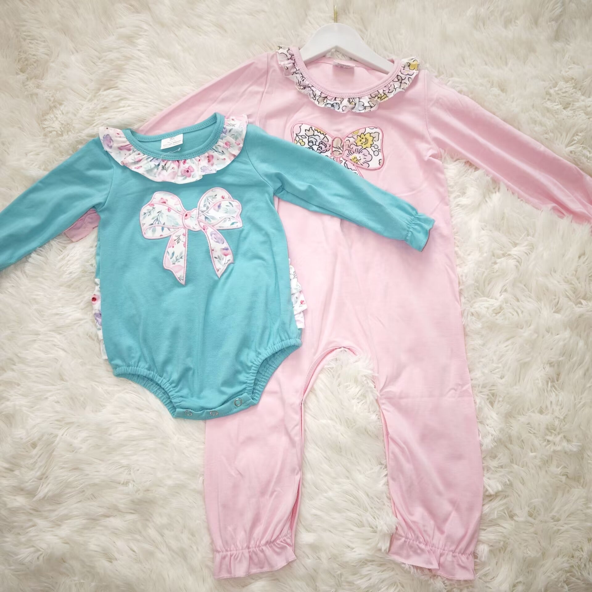 RTS NO MOQ Sibling baby girl clothes embroidery bow long sleeve rompers