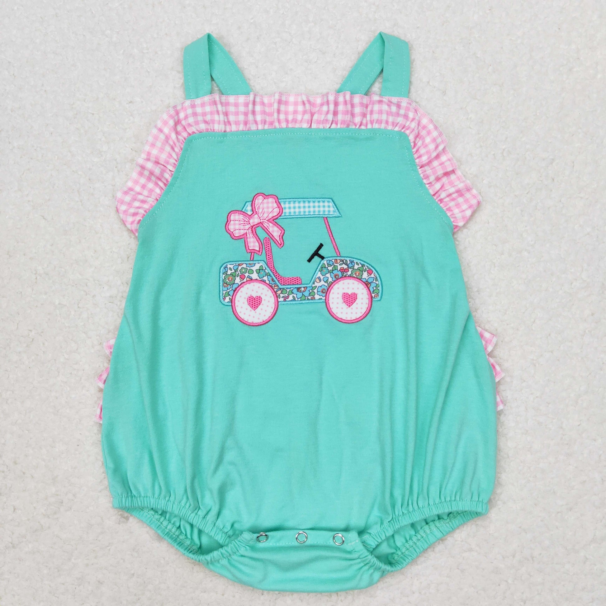 RTS no moq SR1223 Embroidered flower bow sightseeing car pink and white plaid lace blue-green vest jumpsuit
