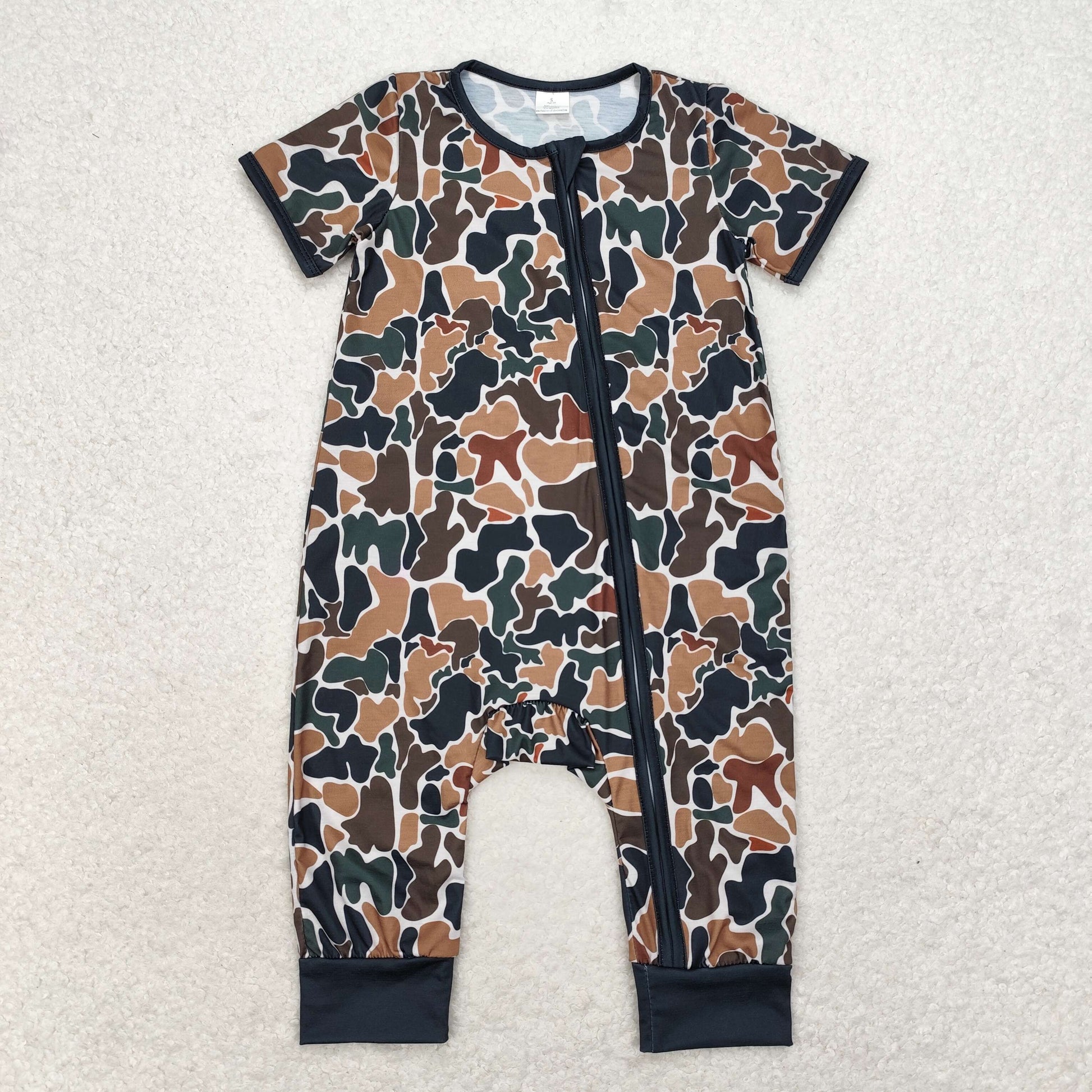bamboo RTS no moq SR1899 Modal green camouflage beige zipper short-sleeved jumpsuit