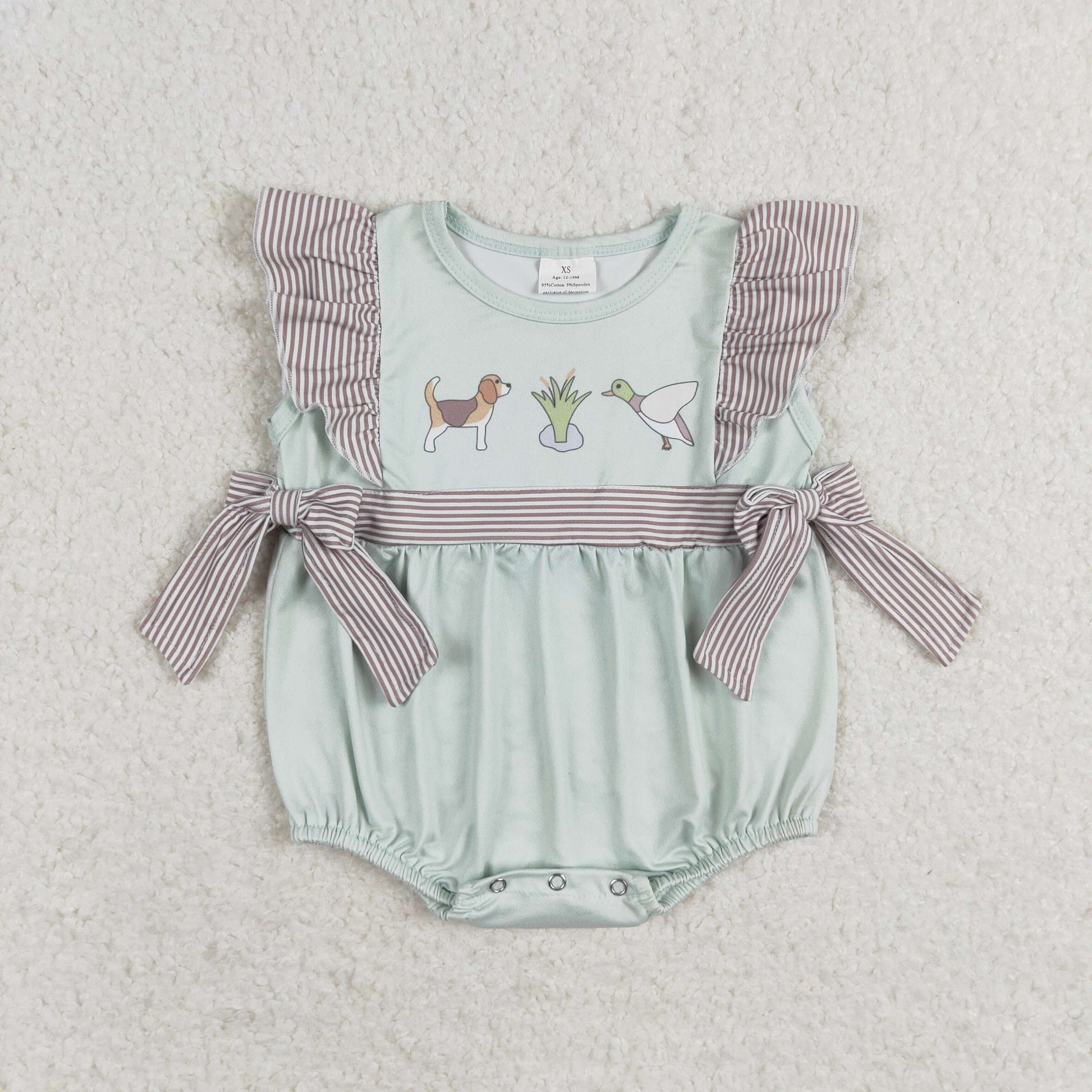 RTS no moq SR1790 Puppy duck striped bow blue-green vest jumpsuit