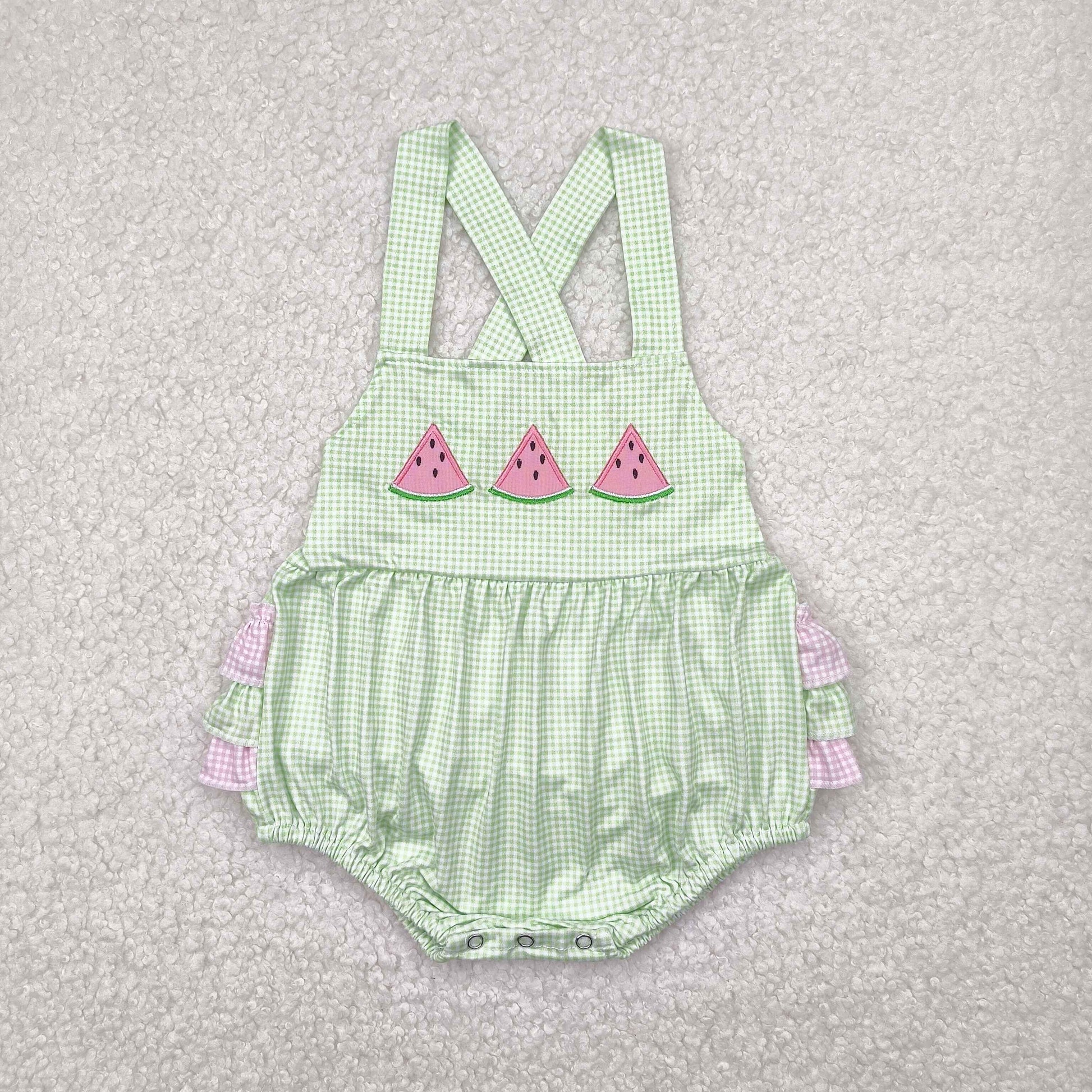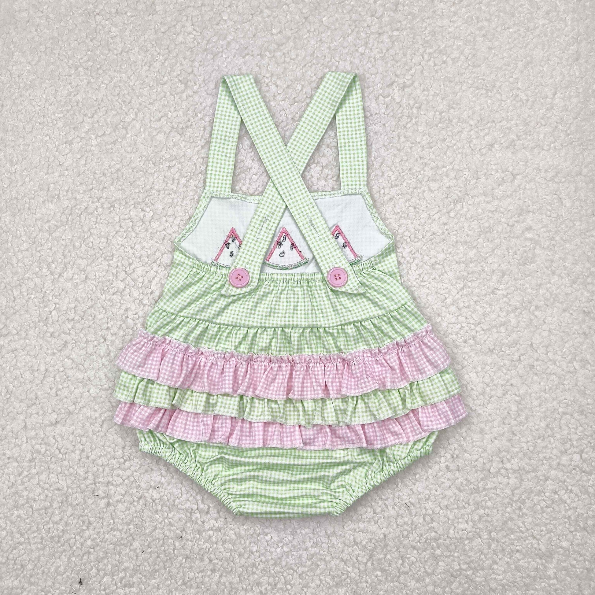 RTS NO MOQ SR2764 Embroidered watermelon pattern lace green plaid flying sleeve vest jumpsuit